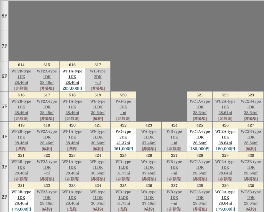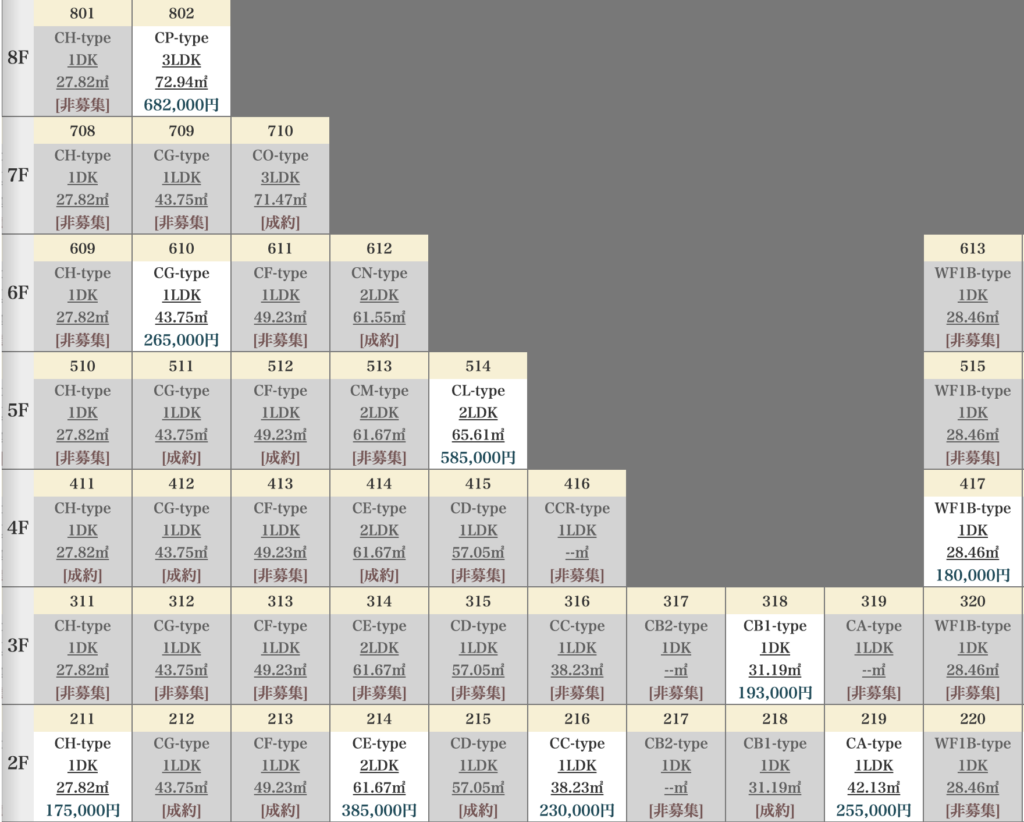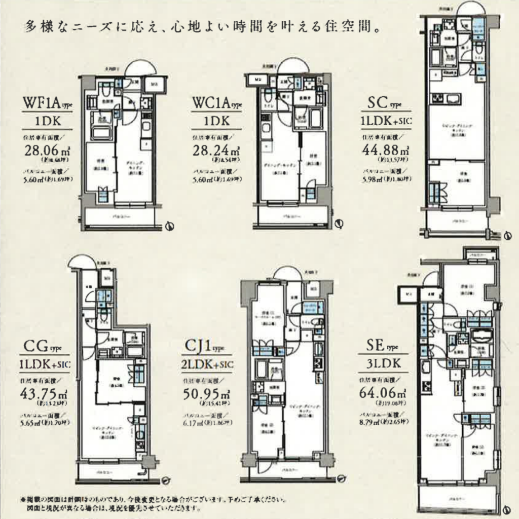 | 間取り/専有面積: 1R+S:44.71㎡ 1DK:27.82㎡〜31.47㎡ 1LDK:30.64㎡〜49.23㎡ 1LDK+S:50.95㎡〜57.05㎡ 2DK:38.48㎡〜41.37㎡ 2LDK:49.24㎡〜65.61㎡ 3LDK:64.06㎡〜72.94㎡ |